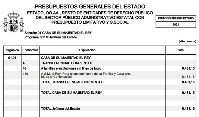 Por tanto, y contra todo pronóstico, el presupuesto de la Casa Real superará en 2021 los ocho millones de euros, con un incremento de un 6,5%, o lo que es lo mismo, más de medio millón de euros respecto a las cuentas vigentes.