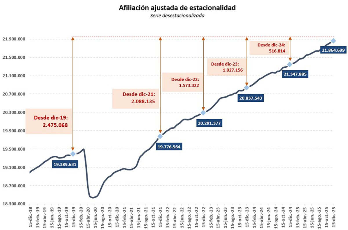 En 2025, se han sumado más de medio millón de afiliados, alcanzando un total de 21.864.699 afiliados registrados en la primera mitad de diciembre.